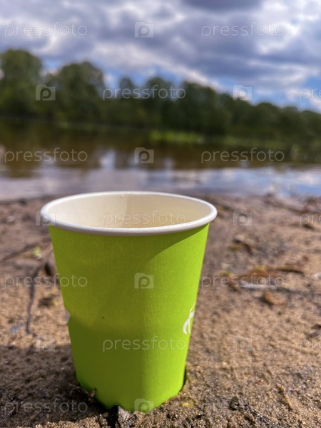 Бумажный стаканчик на фоне красивого берега реки Березина летом