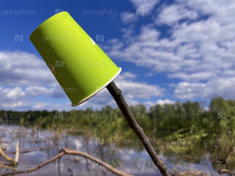 Бумажный стаканчик на фоне красивого берега реки Березина летом