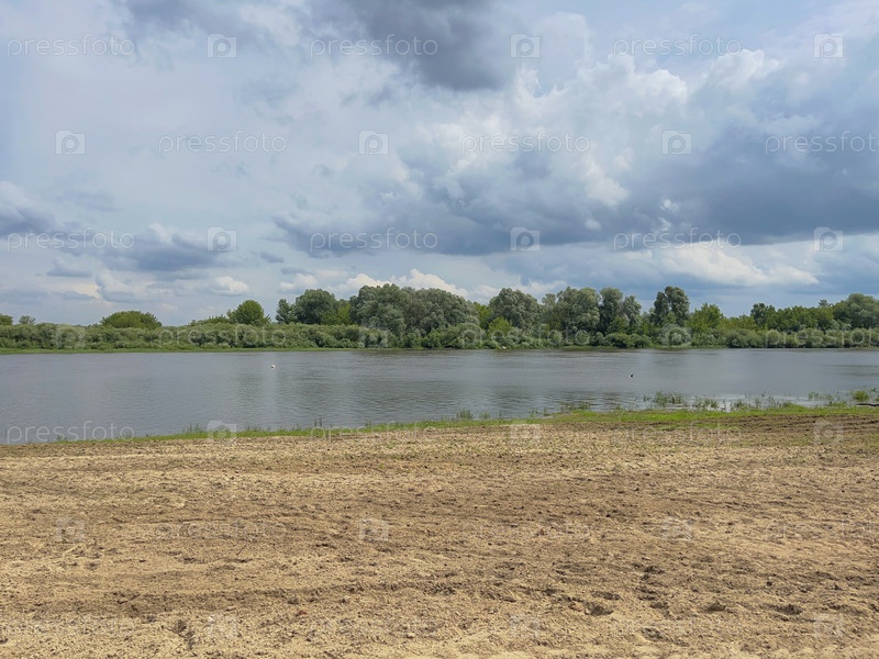 Синяя река под синим летним небом с белыми облаками