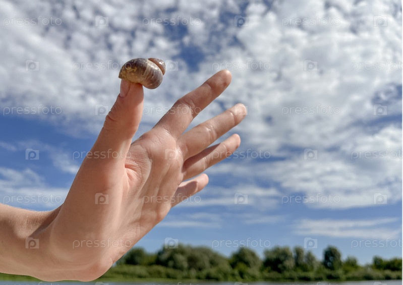 На пляже, фотография руки с ракушкой на пальце