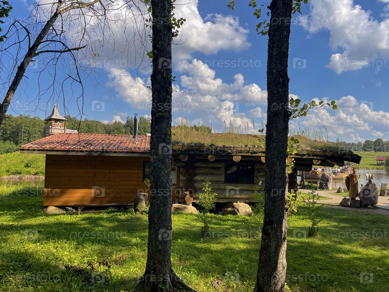 Музей под открытым небом представляет собой деревенскую хижину с зеленой травой, растущей на крыше