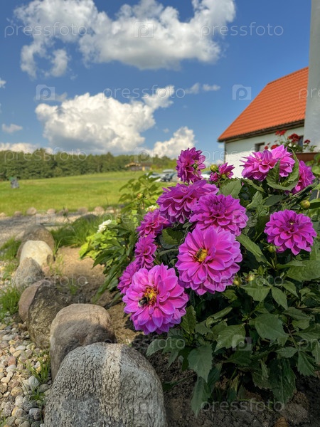 Летом в стране цветут темно-розовые карликовые георгины
