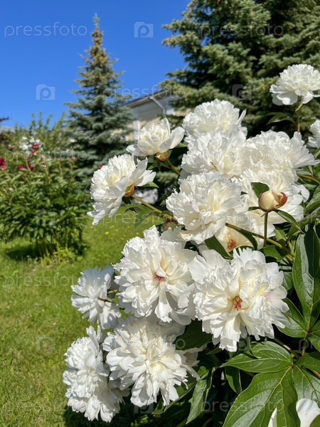 Белые махровые пионы цветут в саду летом в июне