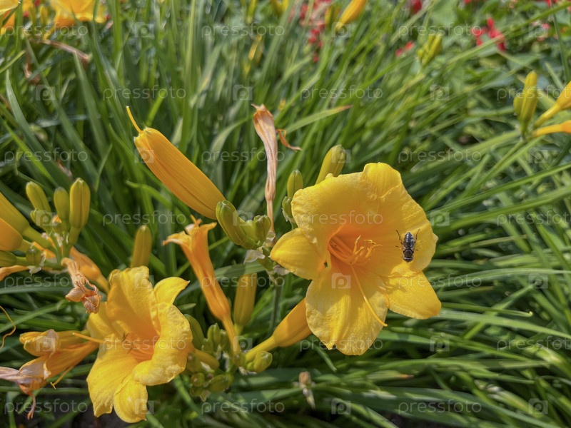 Лилейник мини Стелла цветет желтым цветом на городской клумбе летом