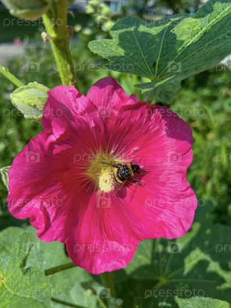 Шмель опыляет розовый цветок мальвы