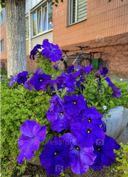 На клумбе в городе цветет голубая петуния