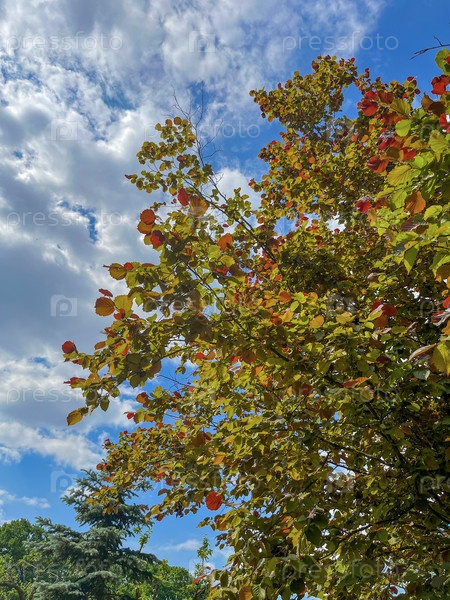 Дерево с красно-зелеными листьями в парке на фоне голубого неба