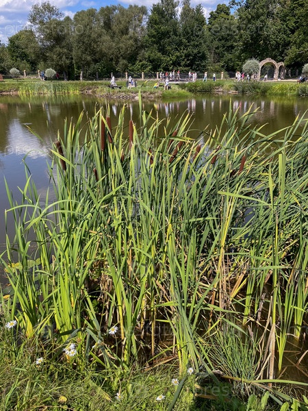 На пруду растут тростник и красивые ромашки