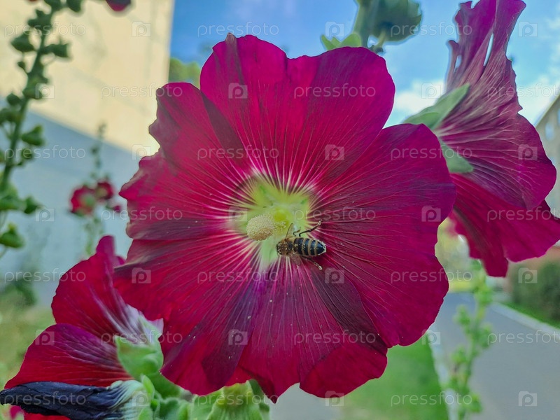 Шмель опыляет цветок мальвы