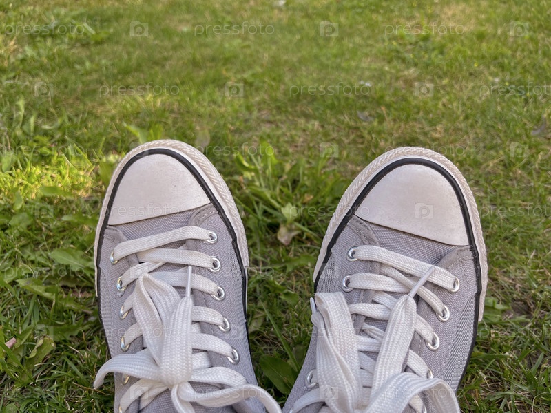 Летние серые кроссовки на зеленой траве летом