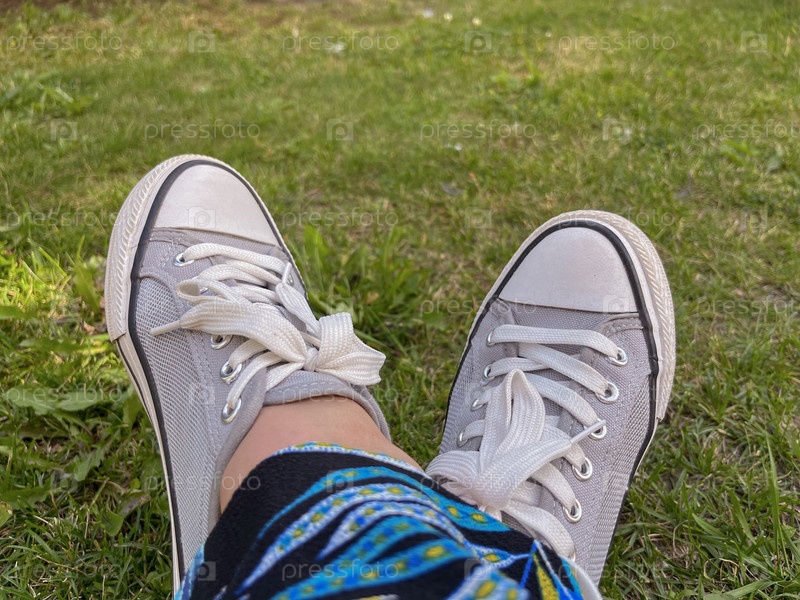Летние серые кроссовки на зеленой траве летом
