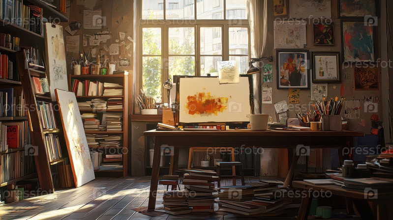Уютная студия художника с книгами и произведениями искусства