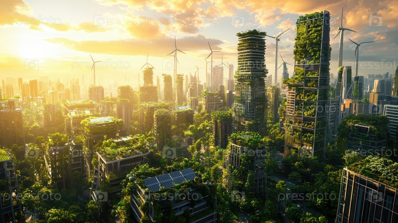 Футуристический зеленый город с вертикальными садами и ветряными турбинами