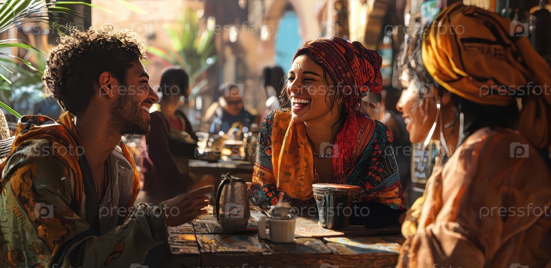 Группа разнообразных друзей, смеющихся вместе в уютном кафе
