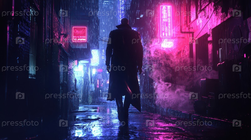 Мужчина в длинном пальто идет под дождем по неоновому переулку