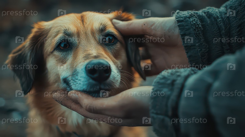 Человек держит собаку с пристальным взглядом на природе