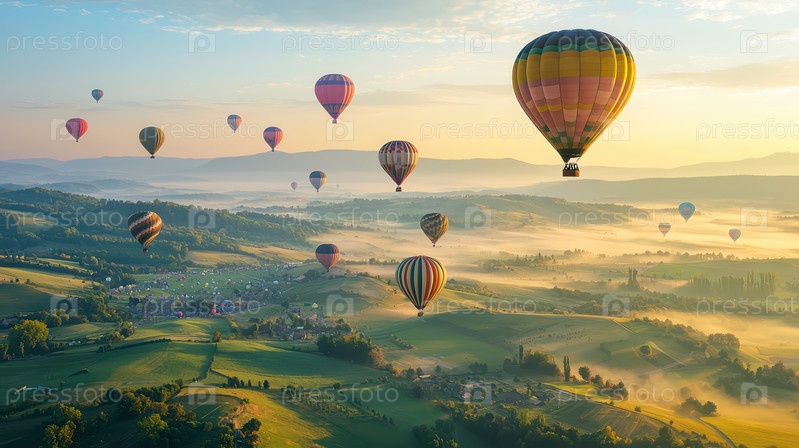 Красочные воздушные шары на рассвете над горным ландшафтом