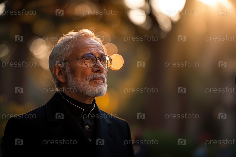Схристианский священник на размытом наружном фоне