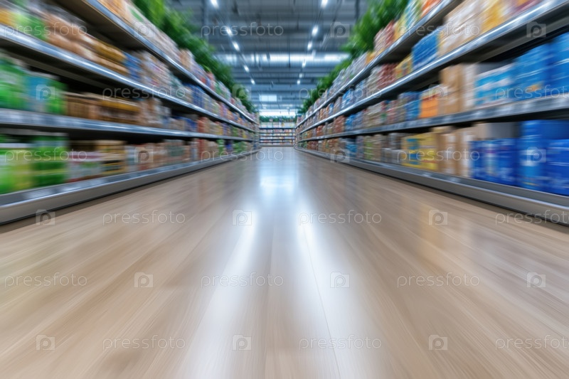 Проход в супермаркете с эффектом размытия движения. Размытое изображение прохода в супермаркете