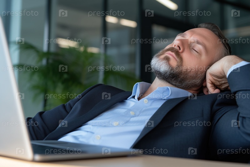 Красивый бизнесмен спит с закрытыми глазами, используя ноутбук на рабочем месте в офисе