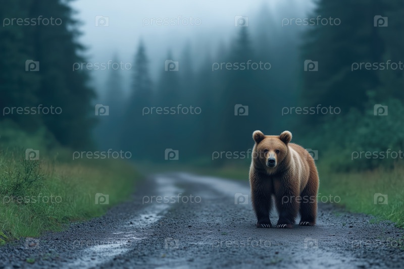 Бурый медведь на дороге в темном лесу
