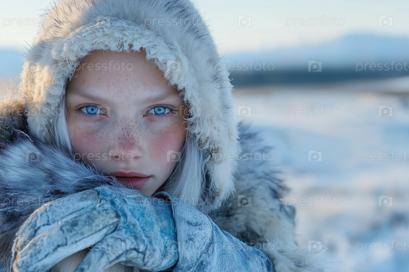 Портрет красивой девушки в меховой одежде с голубыми глазами на фоне зимнего пейзажа