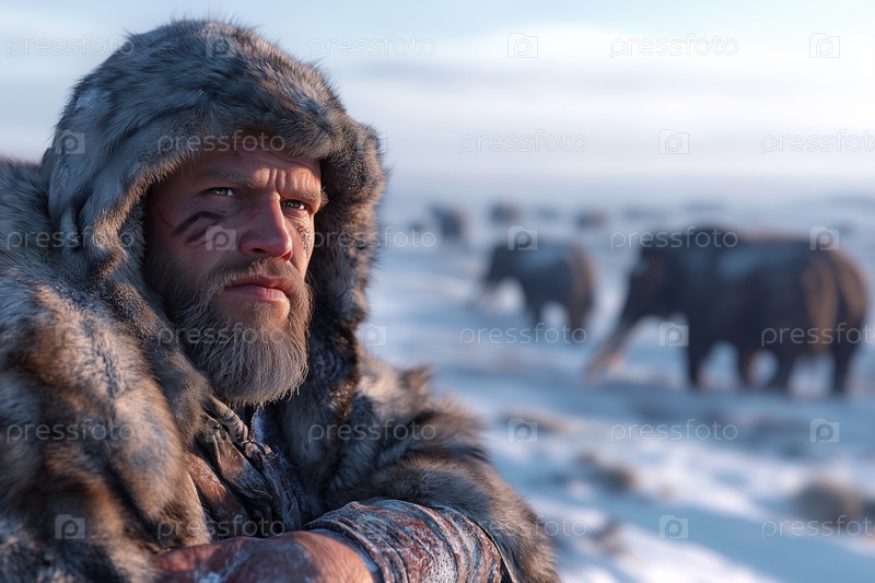 Красивый мужчина в шубе зимой в степи на фоне древних животных