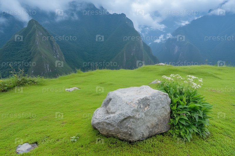 Зеленый луг и скалы в горах,