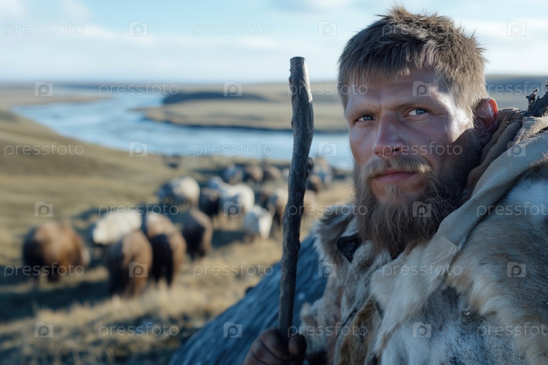 Портрет мужчины в меховой одежде на фоне стада животных