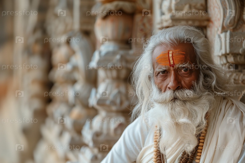 Портрет индуистского отшельника садху на фоне древних храмов