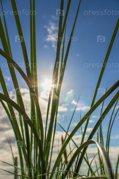 Трава на песчаном пляже под ярким летним солнцем