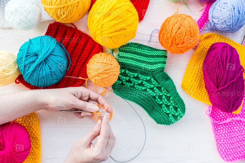 Девочка вяжет носок спицами