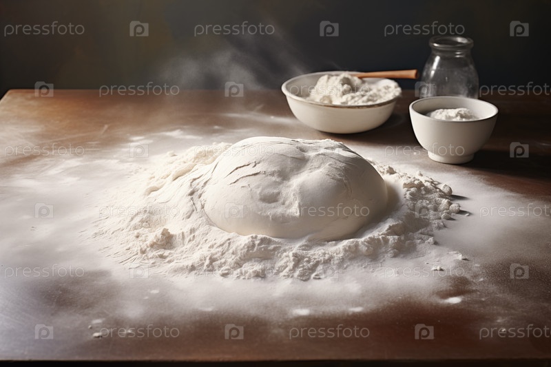 Комок теста среди муки на столе для выпечки, чашки с ингредиентами на заднем плане