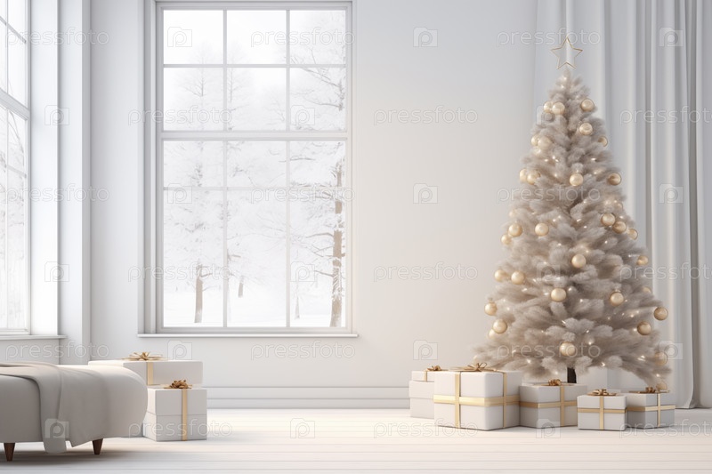 Минималистичный светлый интерьер в скандинавском стиле, украшенный к Новому году, рождественские украшения и подарки под елкой, зимний утренний лес за окном