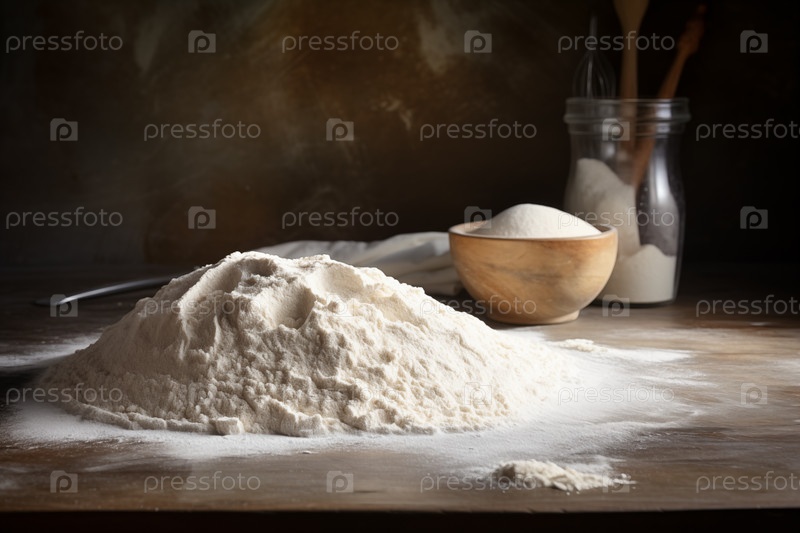 Комок теста среди муки на столе для выпечки, чашки с ингредиентами на заднем плане