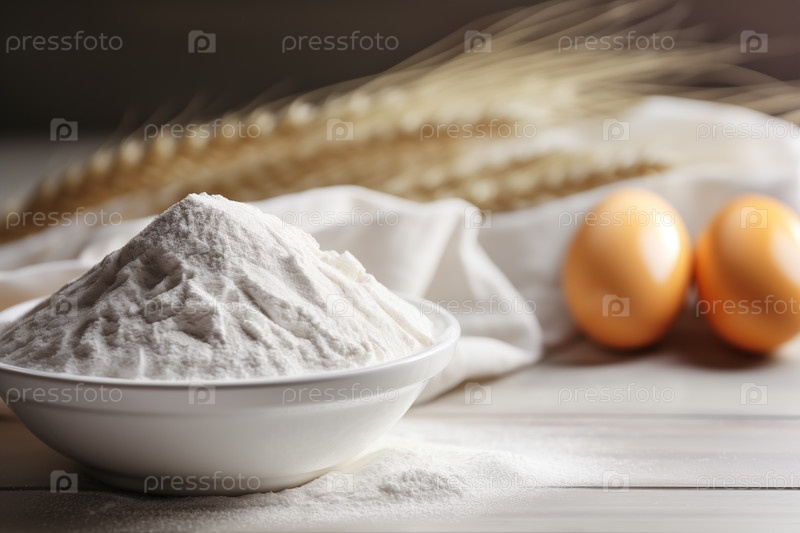 Куча муки в тарелке на столе, на заднем плане видны яйца и колосья хлеба в размытом виде