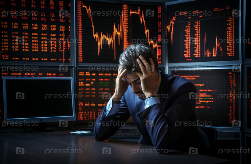 Обеспокоенный бизнесмен на фоне экономического спада и финансового кризиса