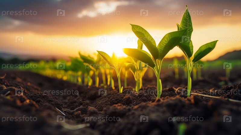 Ряды кукурузных саженцев, растущих на коричневом вспаханном поле на закате. Они символизируют усилия, новое начало, свежесть, чистоту и тепло