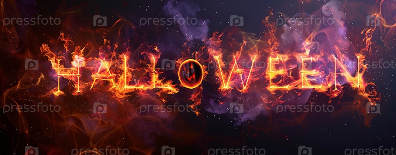 Огненный текст на Хэллоуин со светящимся пламенем и таинственным дымом