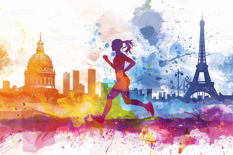 Динамичный силуэт проносится по яркому акварельному изображению парижского городского пейзажа со знаменитой Эйфелевой башней на заднем плане