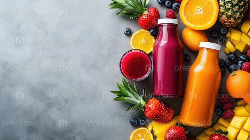 Яркая экспозиция разноцветных фруктовых соков в бутылках, окруженных свежими фруктами и листьями мяты