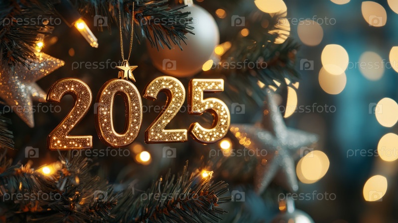 На снимке запечатлена яркая и блестящая атмосфера новогодних праздников с золотыми цифрами 2025 в окружении праздничных украшений и огней боке