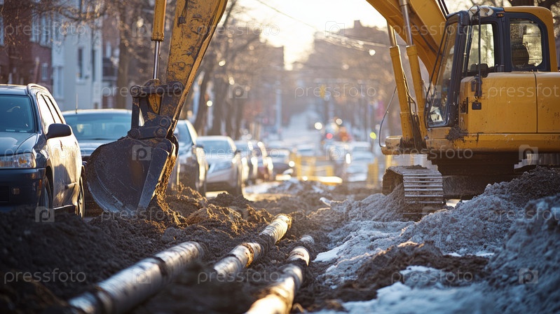 На оживленной городской улице ведутся масштабные строительные работы