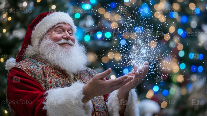 Руки Санты держат снежинки, окруженные светящимися огнями, создавая волшебную праздничную атмосферу