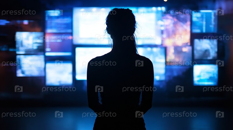 Силуэт женщины, смотрящей на цифровые экраны