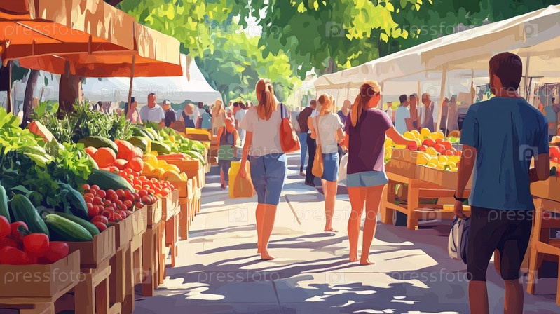 Оживленный фермерский рынок, полный красочных фруктов и овощей, воплощающий суть сообщества и свежести, идеально подходит для любого проекта, которому нужно добавить немного яркой жизни