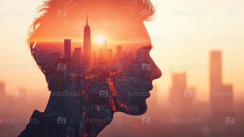 Двойная экспозиция профиля мужчины на фоне городского пейзажа на закате