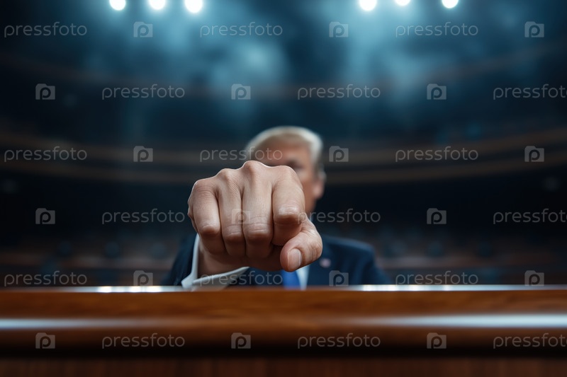 Оратор показывает сжатый кулак во время публичного выступления