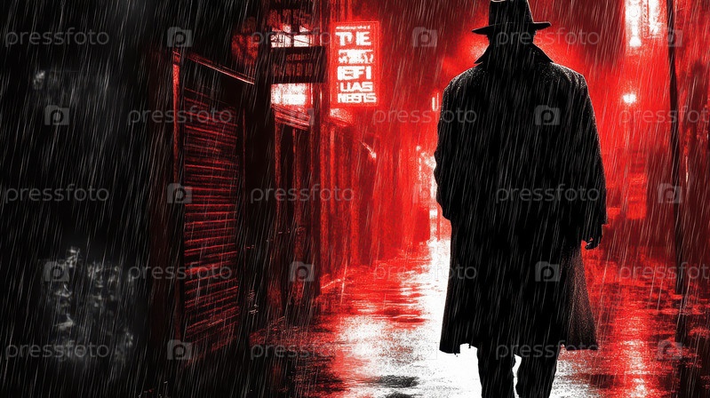 Силуэт мужчины в дождливом нуар-аллее с красными неоновыми огнями