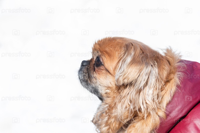 Маленькая собака породы пекинес зимой